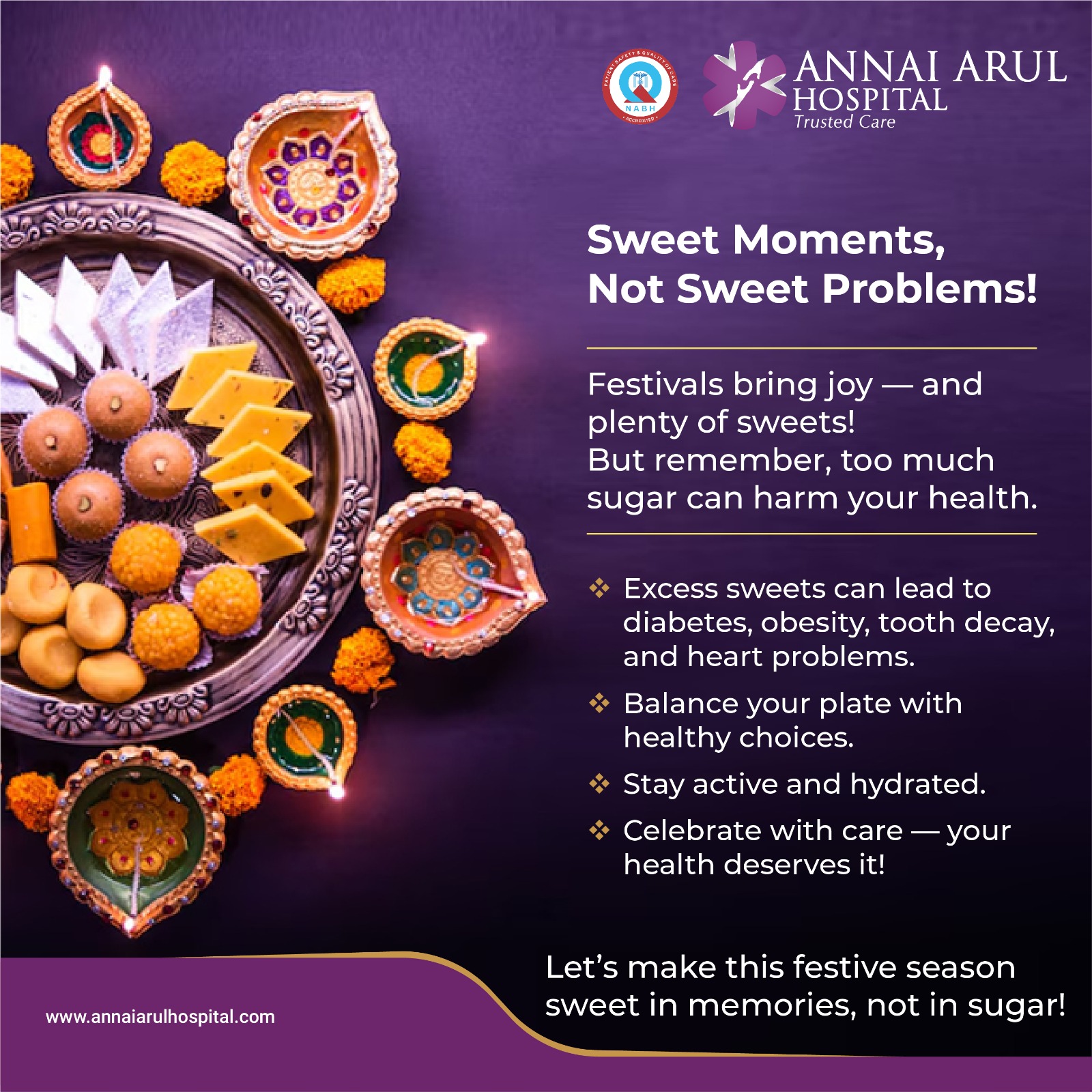 #HealthyFestivals #SweetButSafe #DiabetesAwareness #AnnaiArulHospital #SafeDiwali #CelebrateResponsibly #FireworksSafety